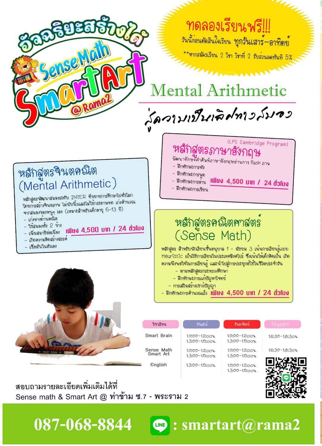 หลักสูตรสำหรับเด็กอายุ 5-13 ปี ใช้ลูกคิด และตัวเลขในการเรียน ช่วยพัฒนาสมองทั้งฝั่งซ้าย ฝั่งขวาให้ทำงานสัมพันธ์กัน เตรียมพร้อมสำหรับการเรียนรู้ได้อย่างเต็มที่ และมีประสิทธิภาพ
